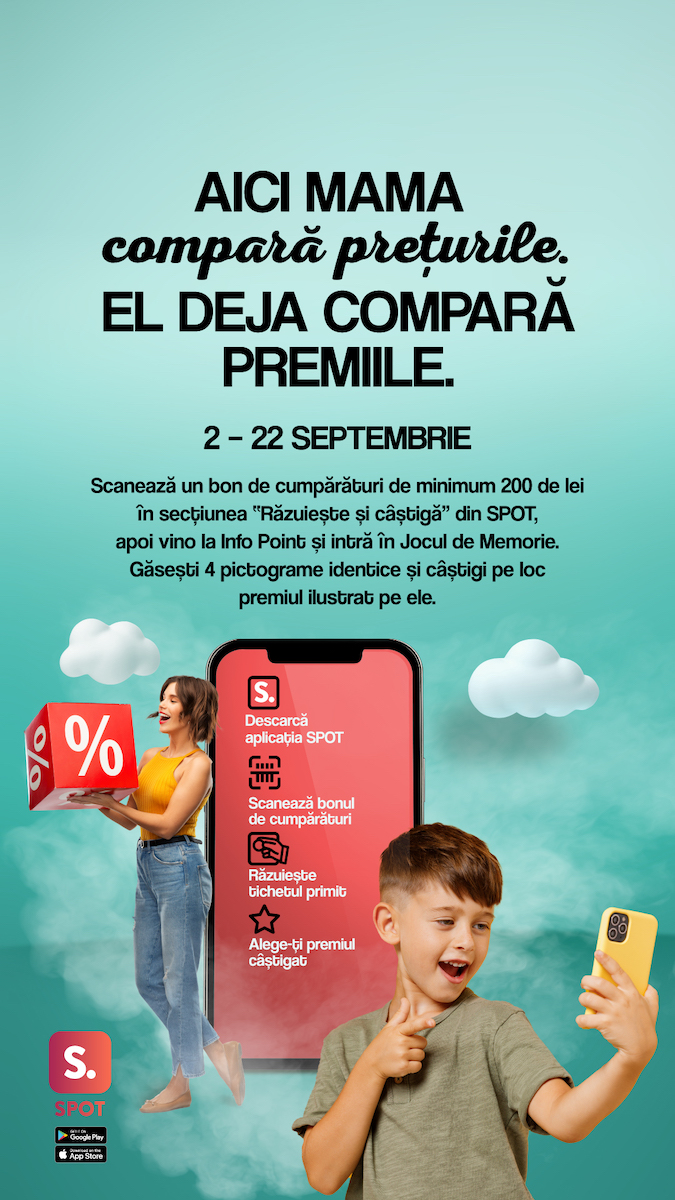În perioada 2 – 22 septembrie, vizitatorii centrului comercial pot intra în joc pentru a câștiga unul dintre cele 500 de premii memorabile, puse la dispoziție prin aplicația SPOT. Pentru a participa, este suficientă scanarea unui bon de cumpărături de minimum 200 lei în aplicație, în secțiunea „Răzuiește și câștigă”, în termen de 48 de ore de la emiterea acestuia.