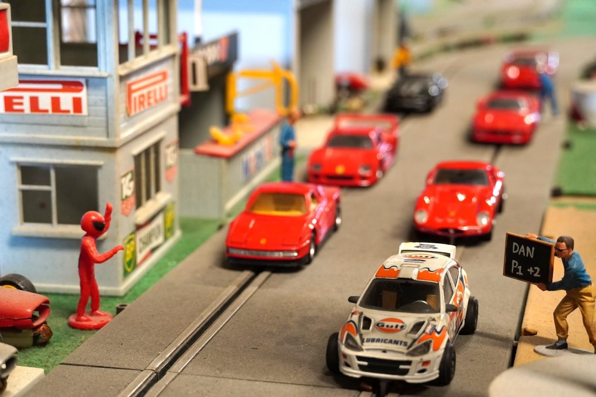 „Totul este făcut de mine. Macheta măsoară șase metri pe doi metri și este potrivită pentru o cursă contratimp. Acum instalez câțiva stâlpi cu senzori de cronometraj. Bunicul avea o reprezentanță a mărcii Ford și pot spune că am crescut printre mașini. Primul meu autoturism a fost un Ford, însă conduc acum o Alfa Romeo, model fabricat 100% în Italia, lucru rar în ziua de azi, în care componentele unei mașini provin de la mai mulți producători. Cumperi Fiat și ai motor de Renault sau cutie de Opel. Practic, nici nu știi ce mașină ai”, spune Guido pentru președinta administrației județului Sibiu