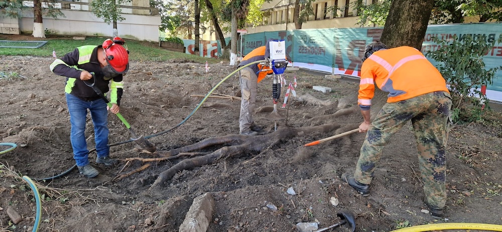Pentru a vedea cu exactitate cum sunt ramificate rădăcinile copacului, în ce direcție merg ele și cum pot fi protejate, Primăria Sibiu și compania Strabag au apelat la Arborist.ro din Brașov, care a venit cu echipamente speciale.