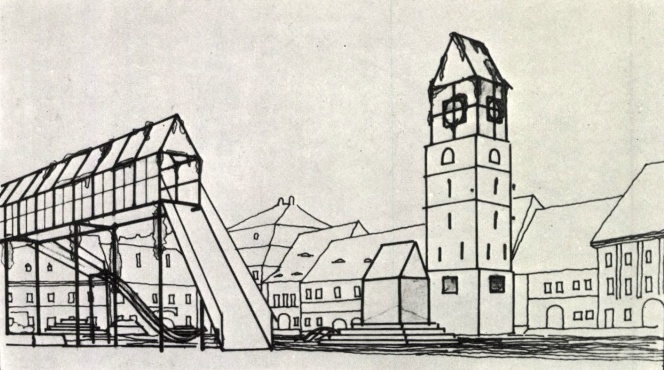 ”Piața poate fi scenă, eșafod sau o punte între TRECUT ȘI PREZENT. Pe suprafaţa ei, se găsesc: un turn, o fântână și câteva semne.
