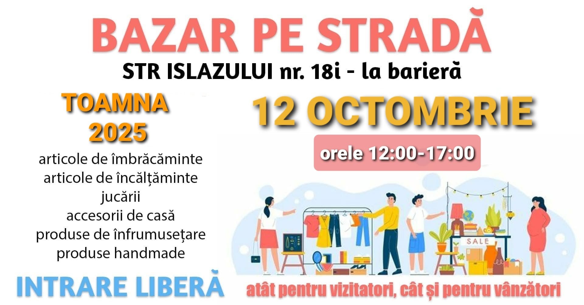 În 12 octombrie, pe Strada Islazului, între orele 12-17, va avea loc un bazar cu articole de îmbrăcăminte și încălțăminte, jucării, accesorii de casă și produse de înfrumusețare.