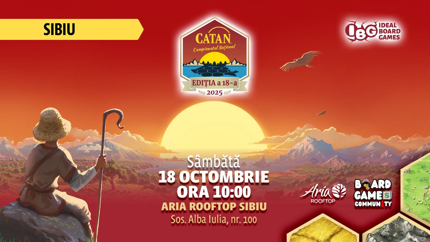 Suntem invitați sâmbătă, 18 octombrie, de la ora 10:00, la Etapa Locală a Concursului Național de Catan – Sibiu, care se va desfășura în cadrul localui Aria Rooftop, situat pe Șoseaua Alba Iulia nr. 100, Sibiu.