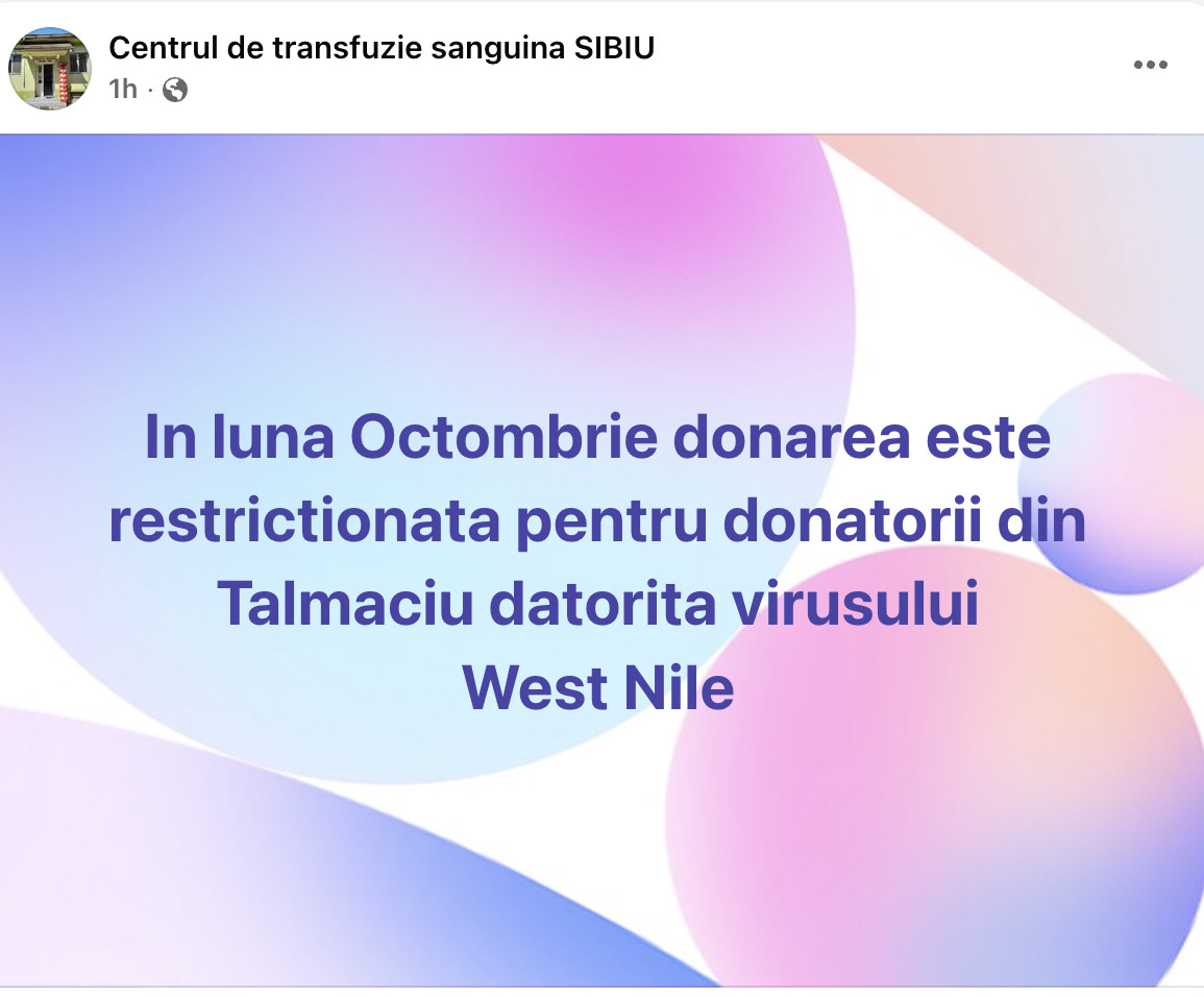 Centrul de Transfuzii din Sibiu a anunțat că, în luna octombrie, donarea de sânge este restricționată pentru locuitorii din Tălmaciu, după confirmarea unui caz de infecție cu virusul West Nile la o persoană internată la Spitalul Județean Sibiu.