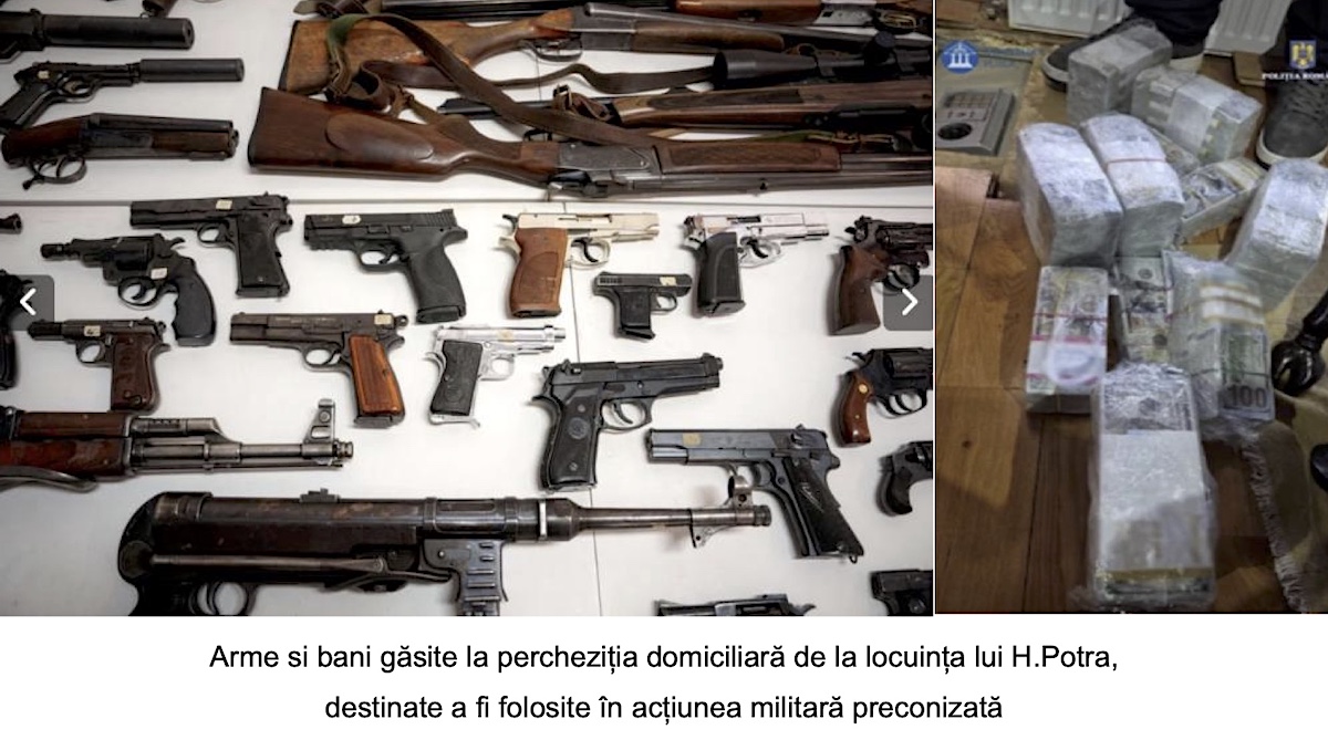 Analiza prezentată de președintele României amintește și motivul pentru care Horațiu Potra este trimis, acum, în judecată, alături de Călin Georgescu și alți 20 de inculpați. „În contextul anulării de către Curtea Constituțională la 06.12.2024 a alegerilor prezidențiale, în dimineața zilei de 07.12.2024, fostul candidat la președinție Călin Georgescu s-a întâlnit în incinta unui centru de echitație, în condiții de clandestinitate, cu Horațiu Potra, ocazie cu care au conceput și pus în aplicare un plan conform căruia Horațiu Potra, împreună cu persoane din cercul său relațional, cu pregătire militară și capacități operative specifice pregătirii militare, urmau să declanșeze în data de 08.12.2024 în municipiul București, acțiuni violente cu caracter subversiv, cu rol de deturnare a caracterului pașnic al acțiunilor de protest derulate, prin infiltrarea în mulțime și detonarea unui întreg arsenal de materiale pirotehnice de uz militar, strategia urmărind, prin efectele create și manipularea emoțiilor colective, în contextul unui moment de maximă tensiune socială, schimbarea ordinii constituționale și împiedicarea exercitării puterii de stat”, se mai arată în raportul unde sunt fotografii cu arme și bani descoperite în locuința lui Horațiu Potra.