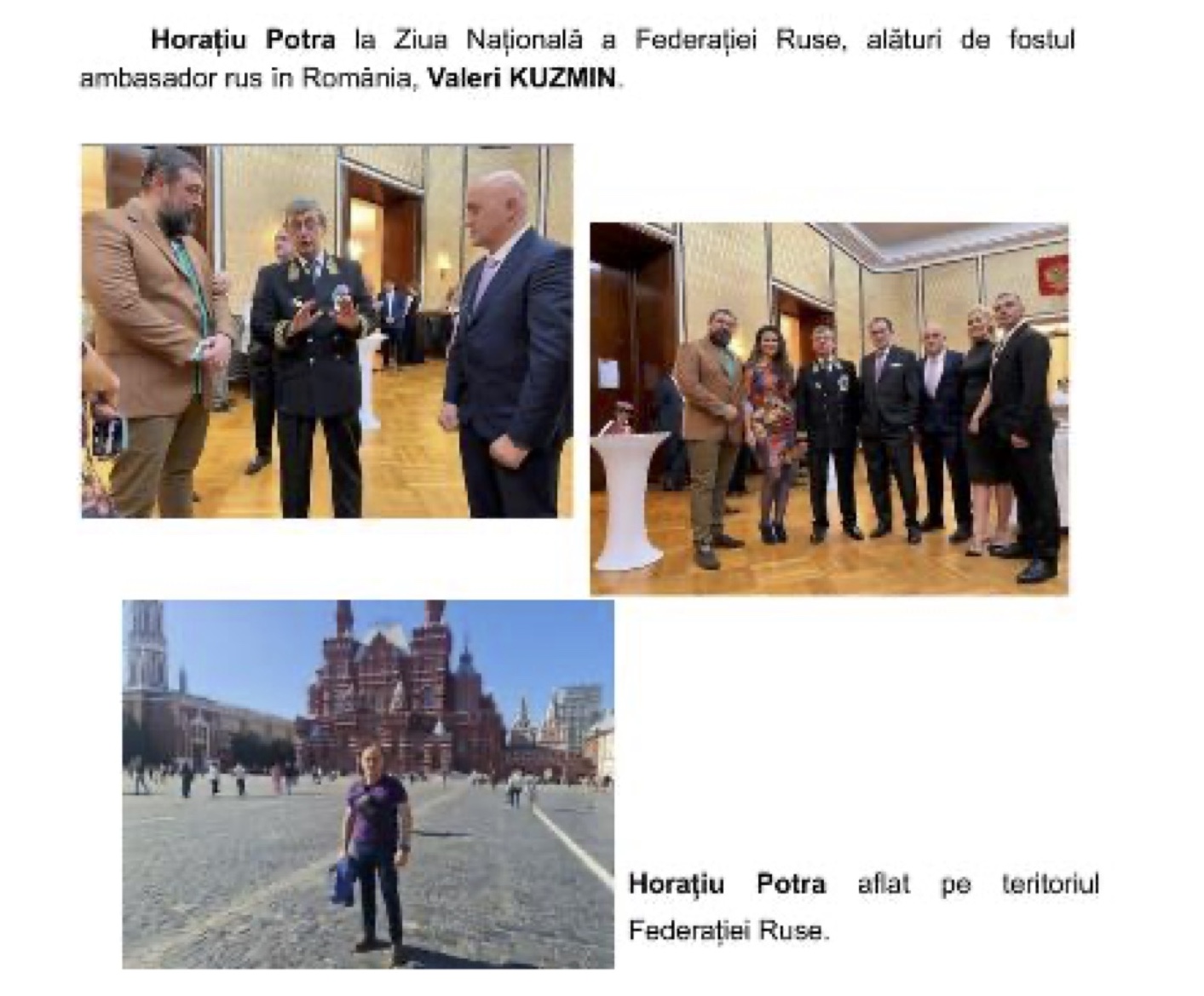 „Horațiu Potra are legături documentate certe cu Federația Rusă, acesta fiind în legătură directă cu personalul Ambasadei Rusiei la București (a se vedea fotografiile cu fostul ambasador rus Valeri Kuzmin) și a făcut repetate deplasări conspirate la Moscova”, se arată în documentul în care sunt publicate și trei fotografii cu Horațiu Potra la evenimente oficiale organizate de autoritățile rusești și, respectiv, la Moscova.