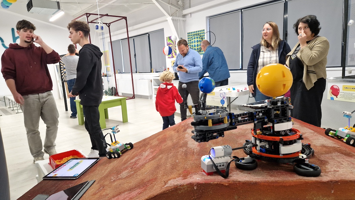 Colegul său, Camil, este și el implicat în proiectul Științescu Hub. „Robotul acesta l-am făcut acum, a fost foarte ușor, l-am terminat în vreo zece minute. Mi se pare foarte frumoasă ideea, să apropii copiii de fizică, cu experimente practice. Îi determină pe cei mici să fie interesați de teoria din spatele experimentelor pe care le văd. Așa a fost și în cazul meu, când eram mai mic am fost la Științescu Hub, la doamna Aura, iar experimentele pe care le-am făcut împreună mi-au crescut interesul pentru fizică în alt mod decât o face un manual. Aplicată, fizica e mai frumoasă. Uite, de exemplu, aici am făcut din lego un experiment prin care o forță imprimată în plan orizontal o mutăm în plan vertical”, spune Camil, elev în clasa a XI-a.