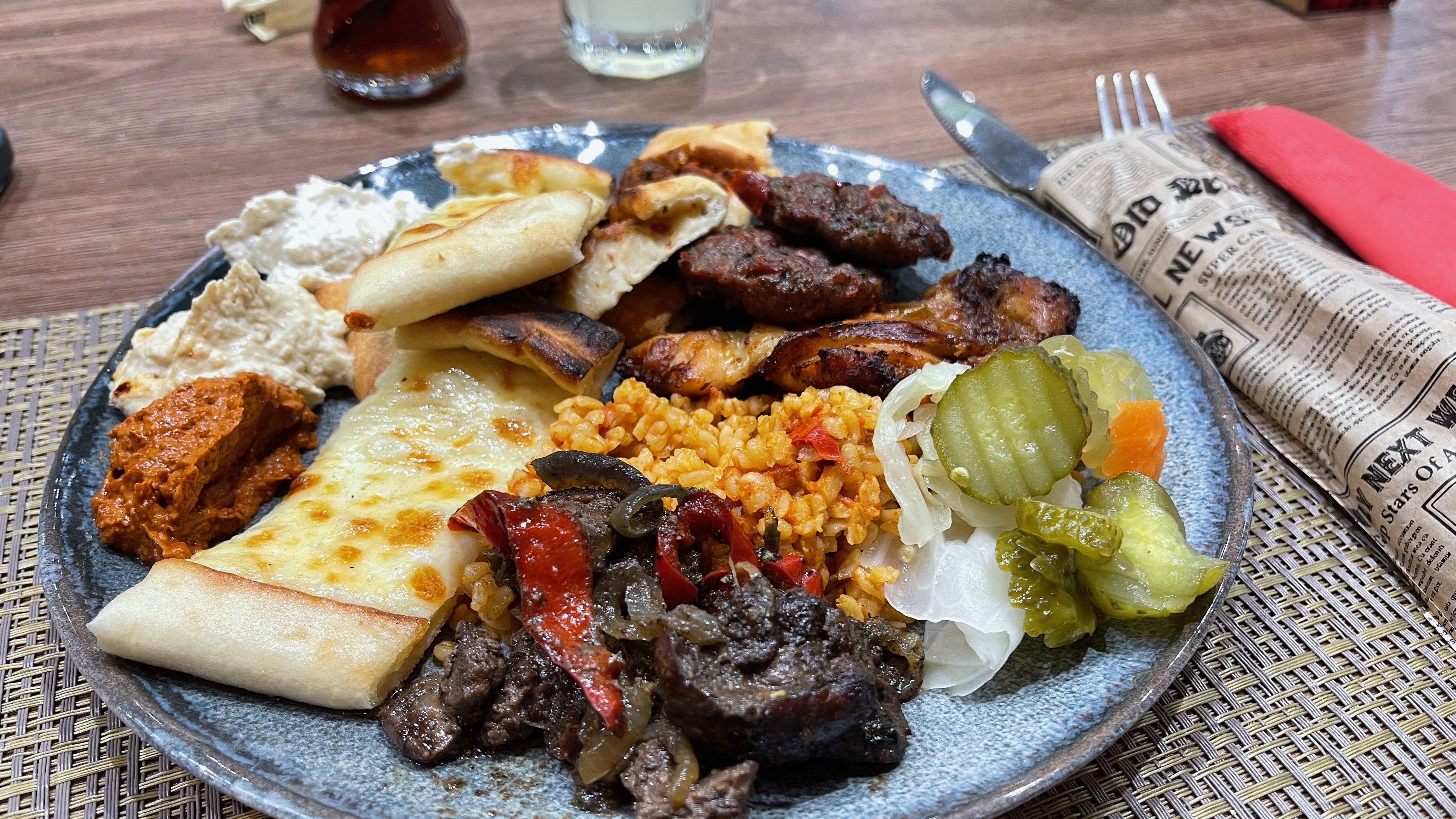 Nici nu e de mirare din moment ce am plecat cu primul platou, că nu-i pot zice farfurie, pe care am pus bulgur, pulpe de pui la cuptor, chiftele din carne de vită combinată cu oaie, pide cu carne, cu brânză – niște bărcuțe din aluat cu umplutură, hummus, muhamarra – o pastă de ardei copți cu nuci, roșii și ulei de măsline (preferata mea din întreg meniul), mutebbel – o pastă de vinete coapte, cu iaurt, pastă de susan și usturoi și murături. Și nu m-am putut abține să nu pun pe farfurie și o lingură sănătoasă cu ficăței cu ceapă și ardei.