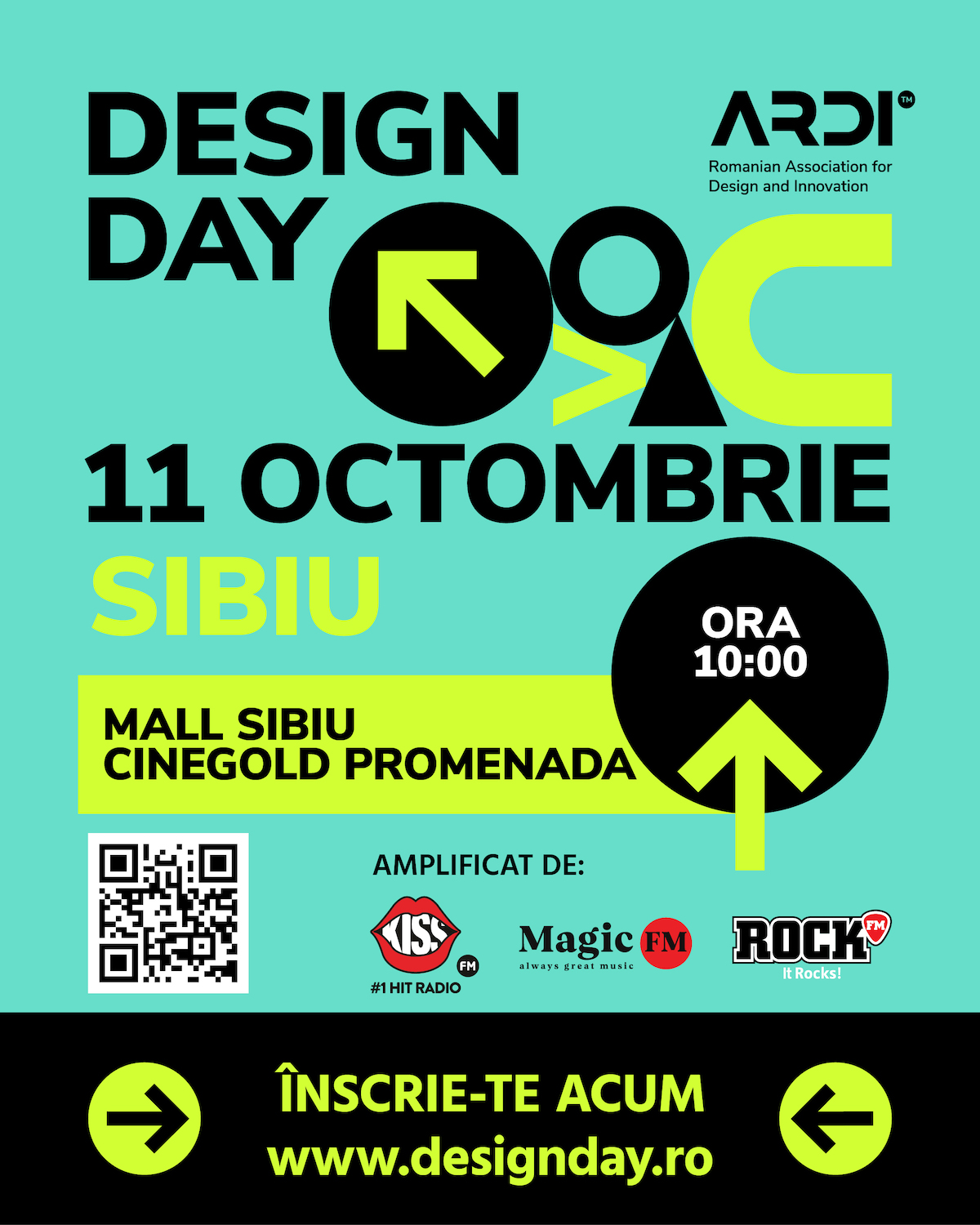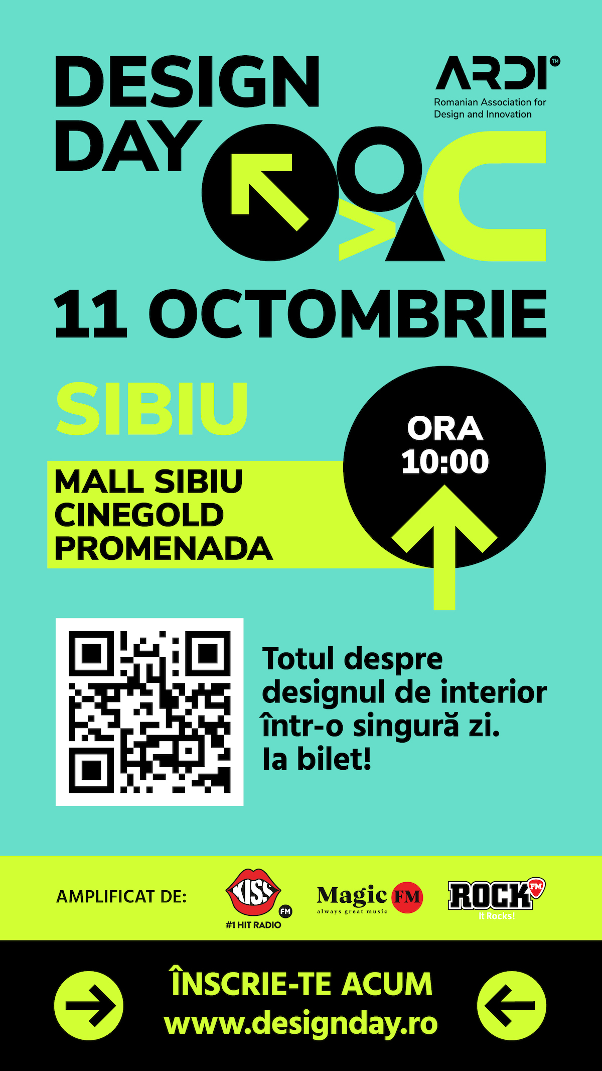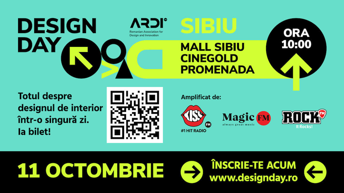 Design Day Sibiu are loc la CineGold Promenada Mall începând cu ora 10:00, iar participarea este liberă. Rezervă-ți locul accesând site-ul www.designday.ro/sibiu.
