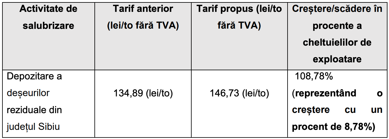 În ceea ce privește depozitarea deșeurilor reziduale din județul Sibiu, operatorul Tracon, care gestionează groapa de la Cristian a solicitat o creștere de peste 8% (de la 134,89 lei/tonă fără TVA la 146,73 lei/tonă fără TVA).