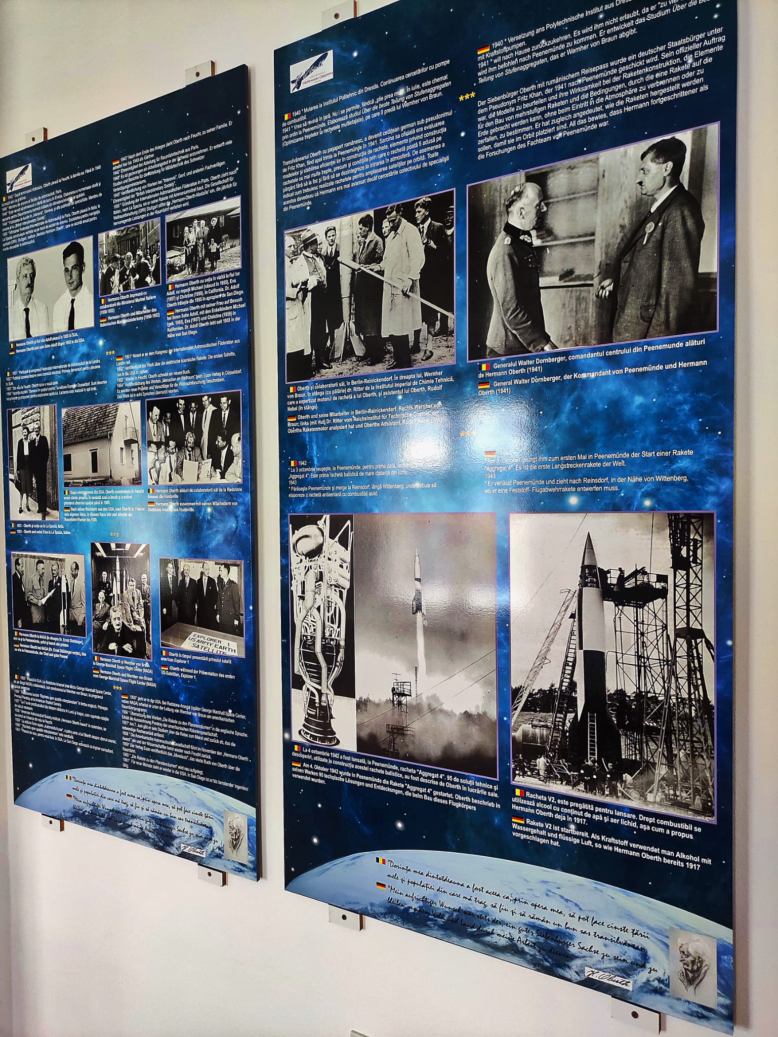 Sala expozițională „Viața lui Hermann Oberth”. În cea mai mare încăpere sunt detaliați cei 95 de ani și jumătate de viață și activitate ai savantului. Din cele povestite de ghidul nostru am extras câteva date mai importante: