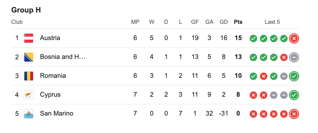 România rămâne pe locul trei în grupă, sub Bosnia, dar cu o diferență redusă. În acest moment are 10 puncte, cu 3 mai puține decât Bosnia și cu 5 mai puține decât Austria.