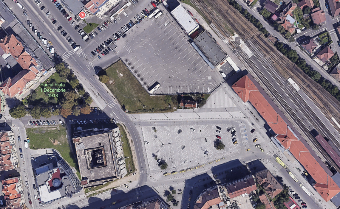 „Actualmente, Piaţa 1 Decembrie 1918, situată în faţa Gării nu beneficiază de valenţele unui spaţiu urban de calitate, capabil să oferă o scară potrivită în raport cu monumentul istoric aflat în imediata sa proximitate - Capela Sânta Cruce. Frontul de nord al pieţei este complet destructurat, fiind ocupat parţial de Capela Sfânta Cruce şi de parcela care generează documentaţia de urbanism, actualmente, teren viran, neamenajat. Vizual însă, frontul nordic este generat de faţadele locuinţelor colective de pe strada Regele Ferdinand, cu un regim de înălţime disproporţionat în raport cu clădirea capelei Sfânta Cruce. Frontul vestic este ocupat de o clădire neterminată, aflată în proprietate privată. în lungul străzii 9 Mai, la intersecţia cu strada Blănarilor, se află un alt teren viran, neamenajat, aflat în proprietatea administraţiei publice locale.