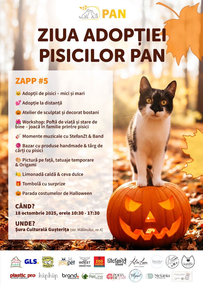 Asociația PAN - Protecția Animalelor și a Naturii şi Șura Culturală Gușterița ne invită sâmbătă, 18 octombrie, între orele 10:30-17:30, la Ziua Adopției Pisicilor PAN, care va avea loc pe strada Mălinului, numărul 4. Iubitorii de animale sunt invitați să descopere pisici care își caută o familie iubitoare, dar și o mulțime de alte ateliere destinate atât adulților, cât și copiilor.
