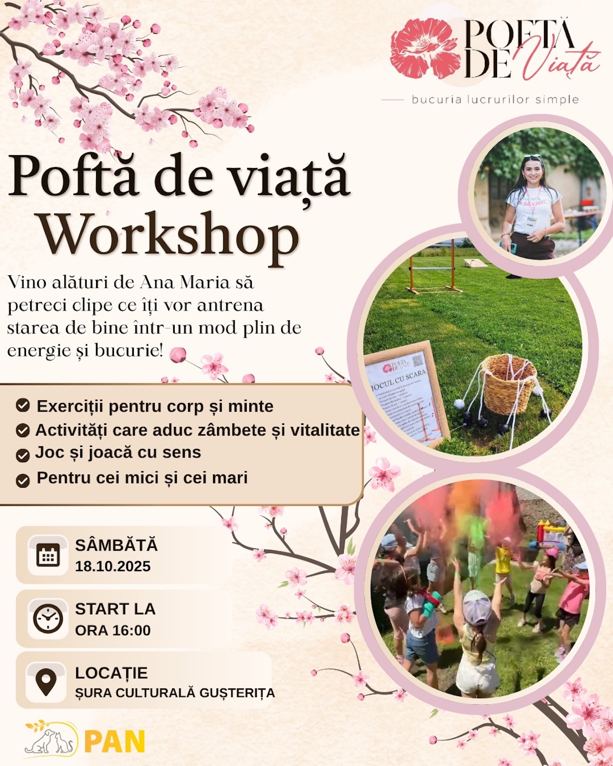 - Workshop Poftă de viață și stare de bine – joacă în familie, printre pisici, o activitate relaxantă de reconectare, râsete și exerciții ușoare, în familie, printre pisici;