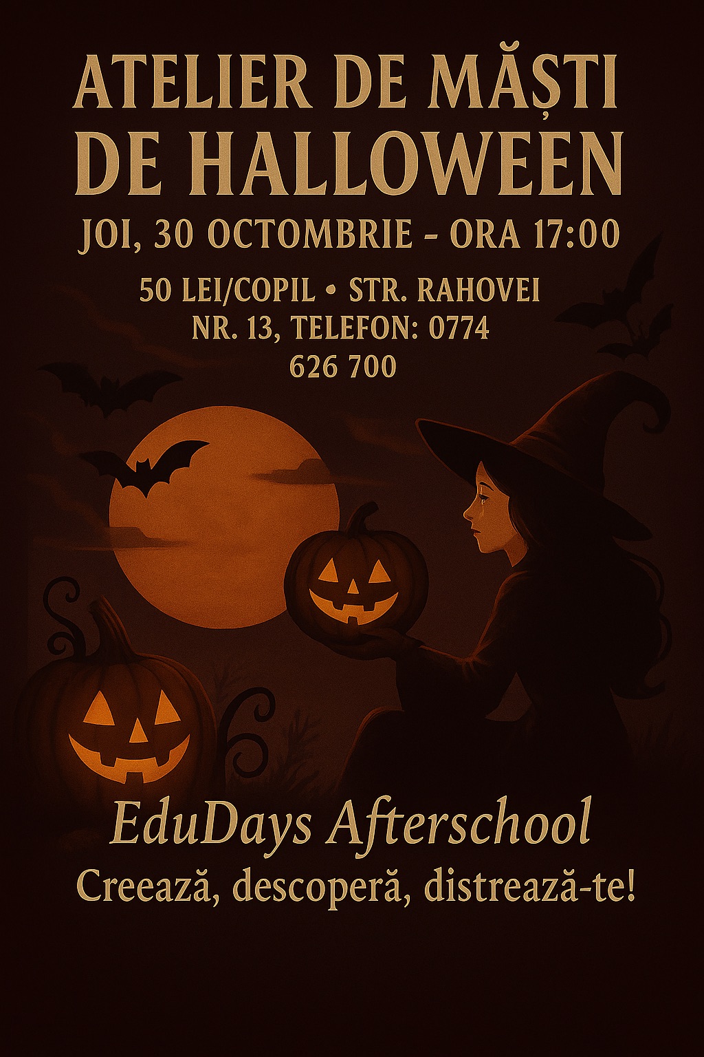 Marți, 28 octombrie, de la ora 17: 30, copiii sunt invitați la un eveniment plin de creativitate, distracție și bună dispoziție: atelier de sculptat dovleci și petrecere de toamnă.