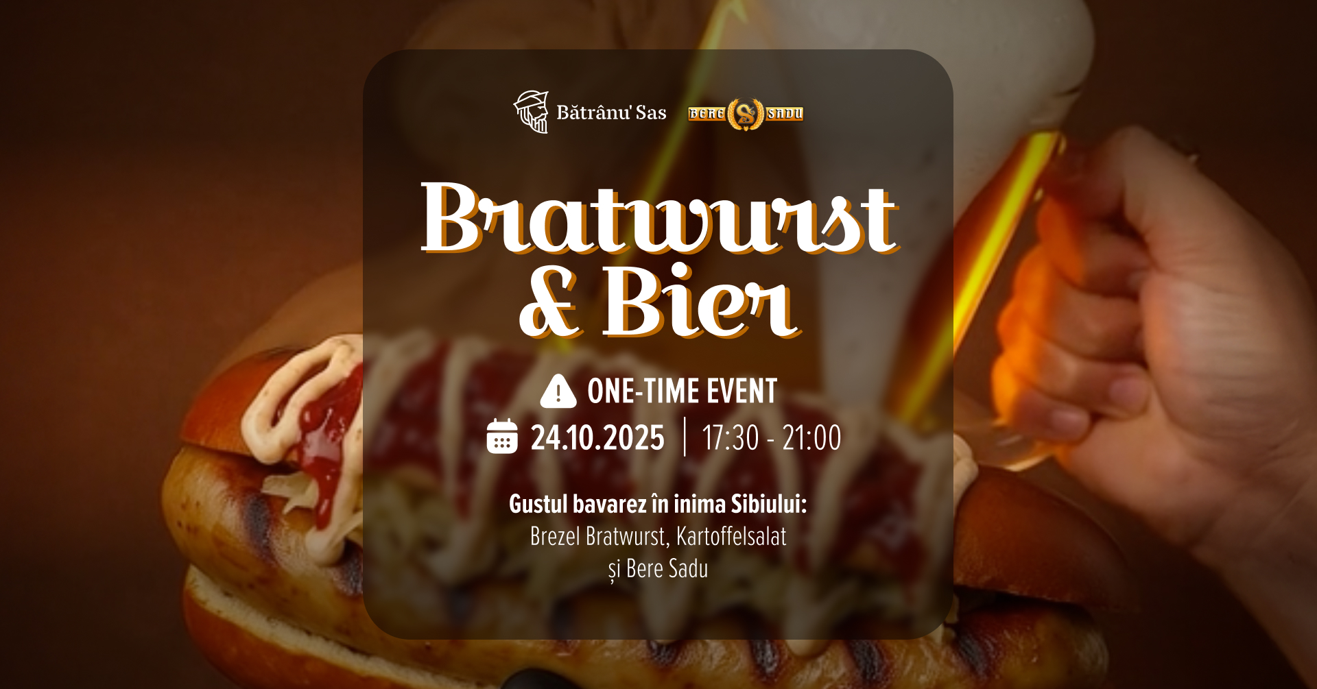 Bătrânu' Sas Cibinium ne invită vineri, 24 octombrie, între 17:30 și 21:00, să intrăm în atmosfera de Oktoberfest și ne ospătăm cu un bratwurst și bere locală. Detalii despre eveniment aici.