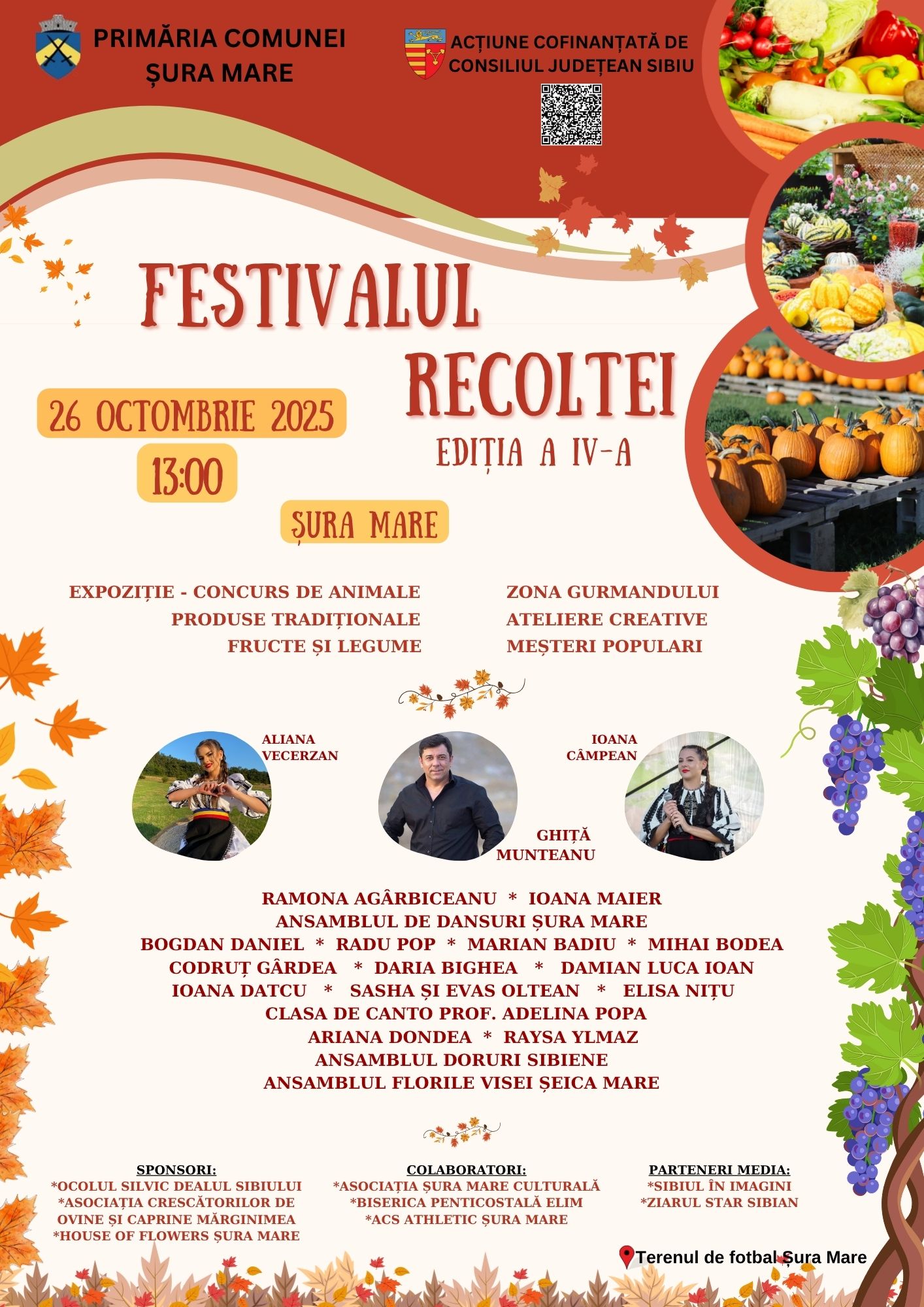 Festivalului Recoltei din Șura Mare are loc duminică, 26 octombrie, începând cu ora 13.00. Printre invitați se numără cântăreții Ghiță Munteanu și Aliana Vecerzan.