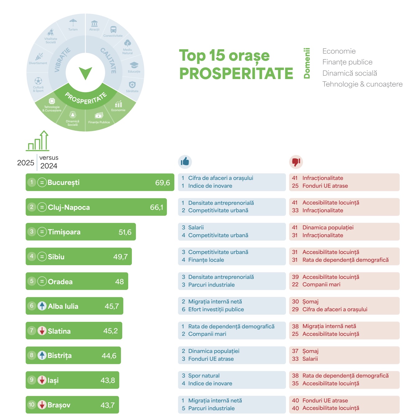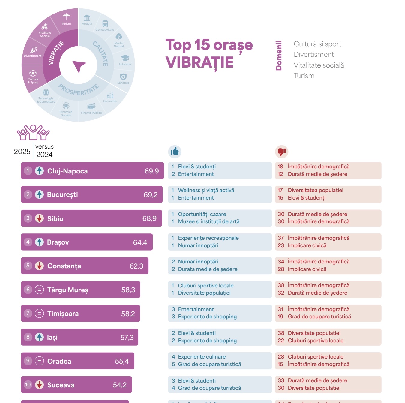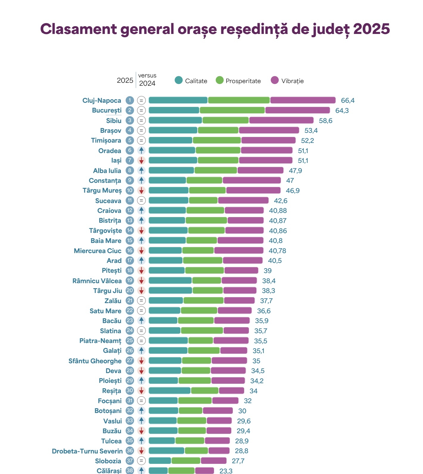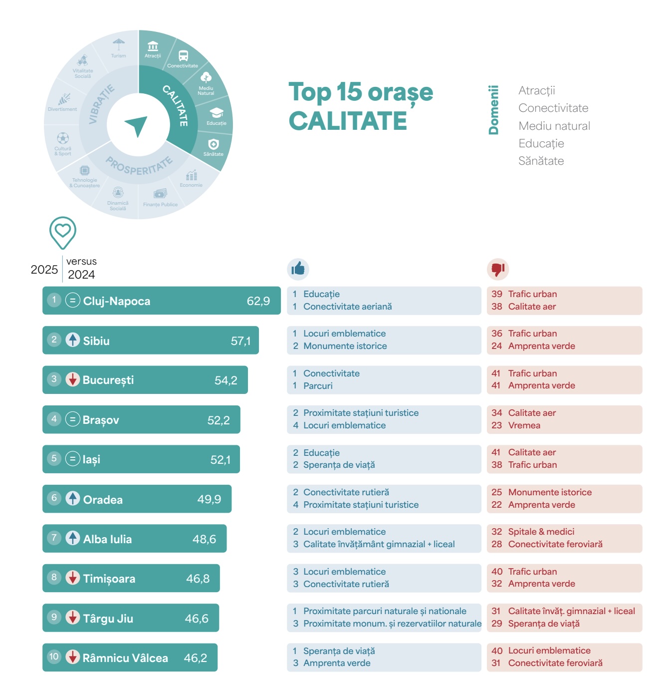 ”În zona de elită există stabilitate, în timp ce restul clasamentului cunoaște repoziționări rapide. Top 10 orașe rămâne aproape identic cu cel din 2024 – Cluj-Napoca, București, Sibiu, Brașov, Timișoara, Iași, Oradea, Târgu Mureș, Alba Iulia și Constanța, cu doar câteva permutări interne. (Indiferent de metodologia utilizată și studiu realizat, pe date obiective sau perceptuale, un grup restrâns de orașe – București, Cluj-Napoca, Brașov, Sibiu, Timișoara, Oradea și Iași – domină constant primele poziții).