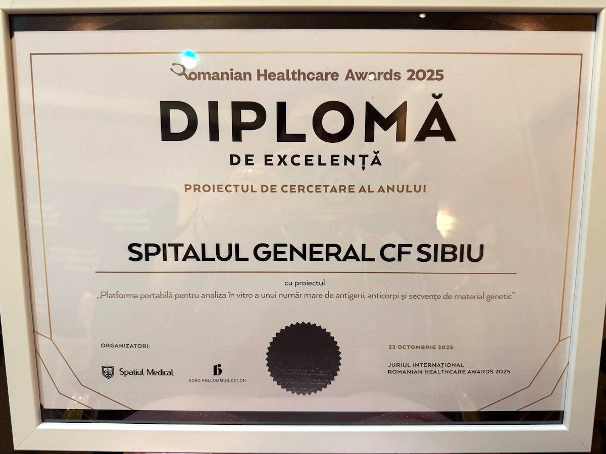 Gala Romanian Healthcare Awards a avut loc în București, pe 23 octombrie, iar spitalul sibian a primit diploma în cadrul ROHO 2025 Romanian Hospital and Healthcare Convention. Evenimentul celebrează excelența în domeniul sănătății din România.