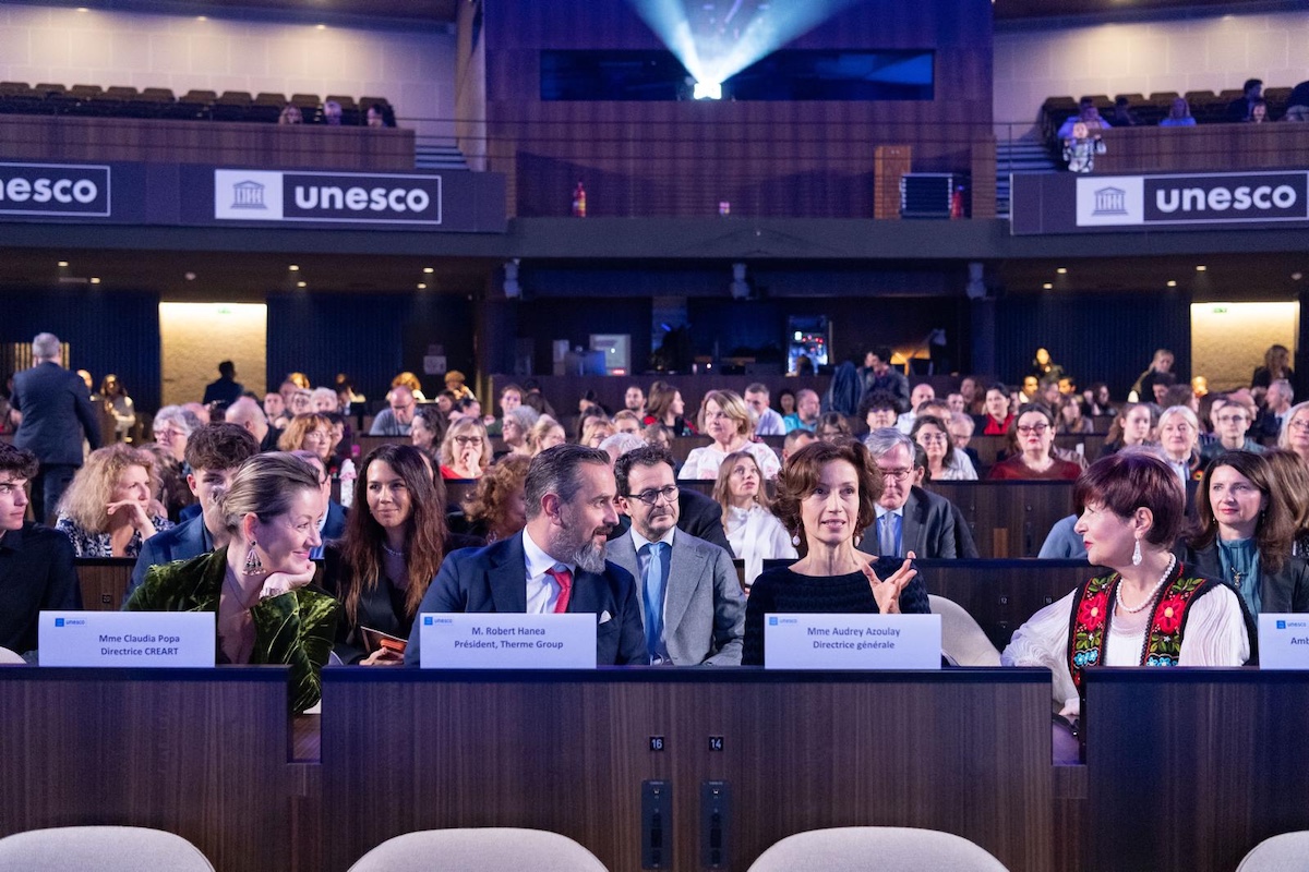 Directorul general al UNESCO, Audrey Azoulay, încadrată de Cladia Popa (CREART), Robert Hanea (Therme Group) și Simona-Mirela Miculescu (ambasadorul României la Paris). Sursa foto: Cyril Bayeul