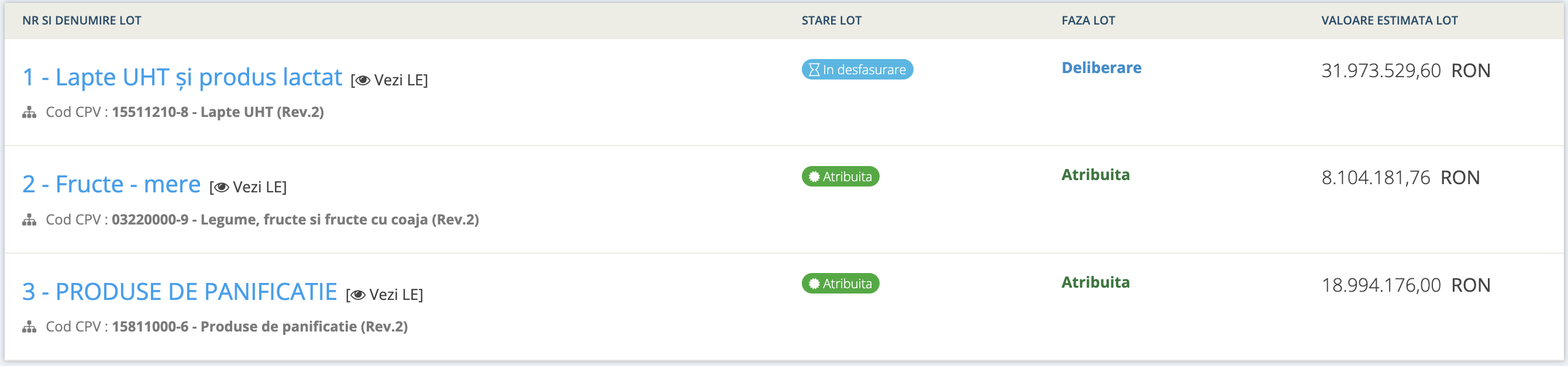 Pentru lotul 1 – Lapte și produse lactate, contractul nu a fost încă atribuit. Valoarea estimată a acestui lot este cuprinsă între 26,1 milioane lei și 31,9 milioane lei fără TVA, pentru întreaga perioadă a acordului-cadru.
