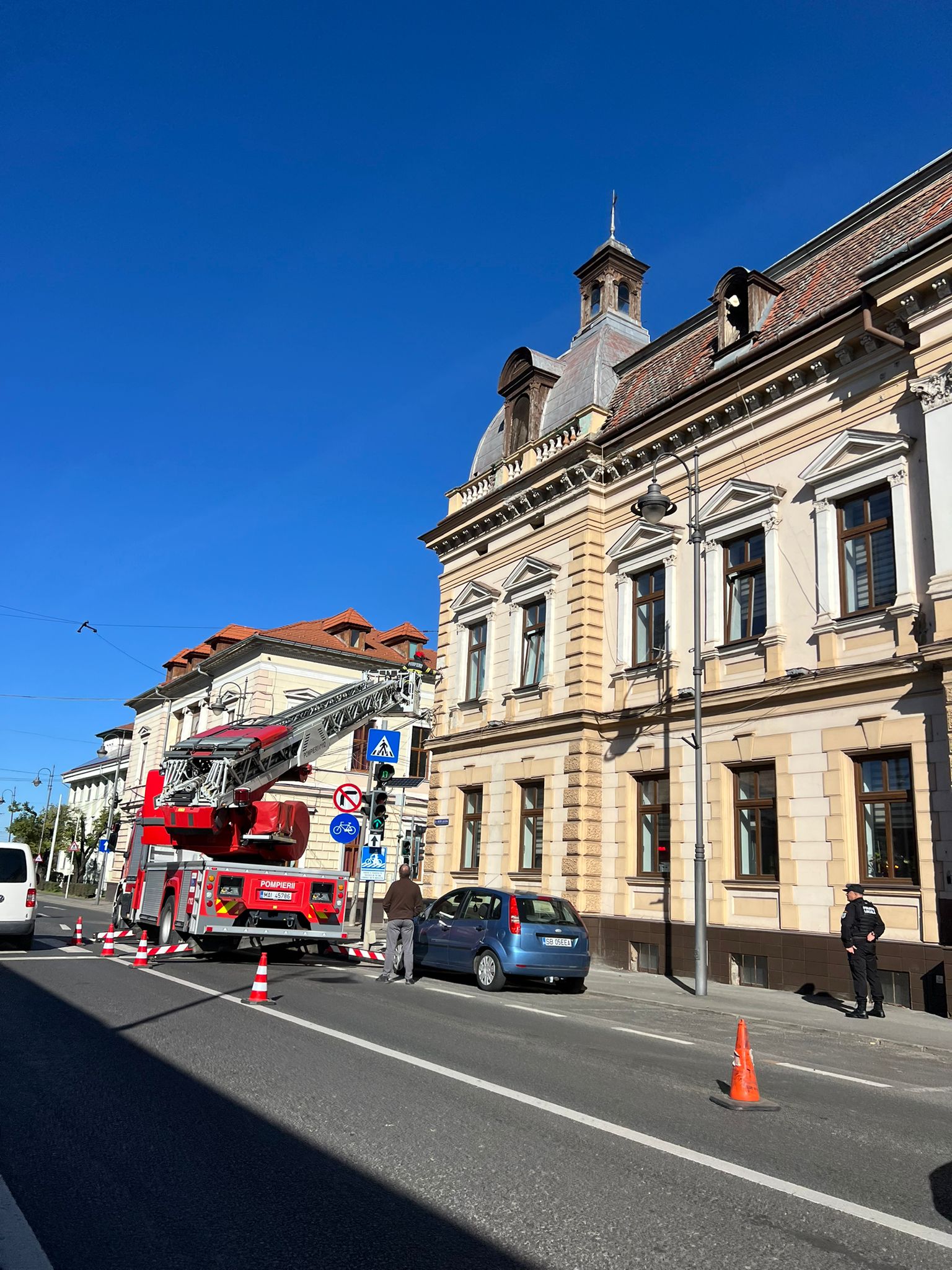 Pompierii sibieni intervin miercuri pentru îndepărtarea unor elemente de construcție aflate în pericol de cădere, de pe clădirea prefecturii, anunță sg. maj. Marcu Raluca, purtător de cuvânt al Inspectoratului pentru Situații de Urgență (ISU) Sibiu.