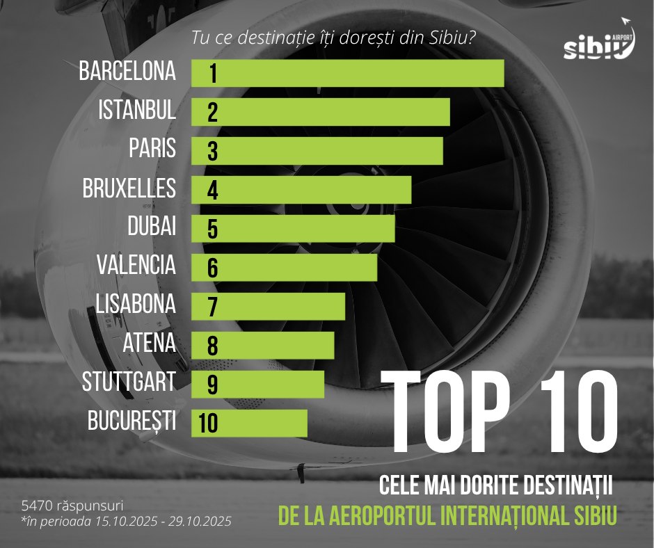Sondajul reflectă „o imagine clară a destinațiilor spre care sibienii, și nu doar ei, își doresc să zboare în viitor de la Sibiu,” spun reprezentanții aeroportului, într-o postare pe Facebook.