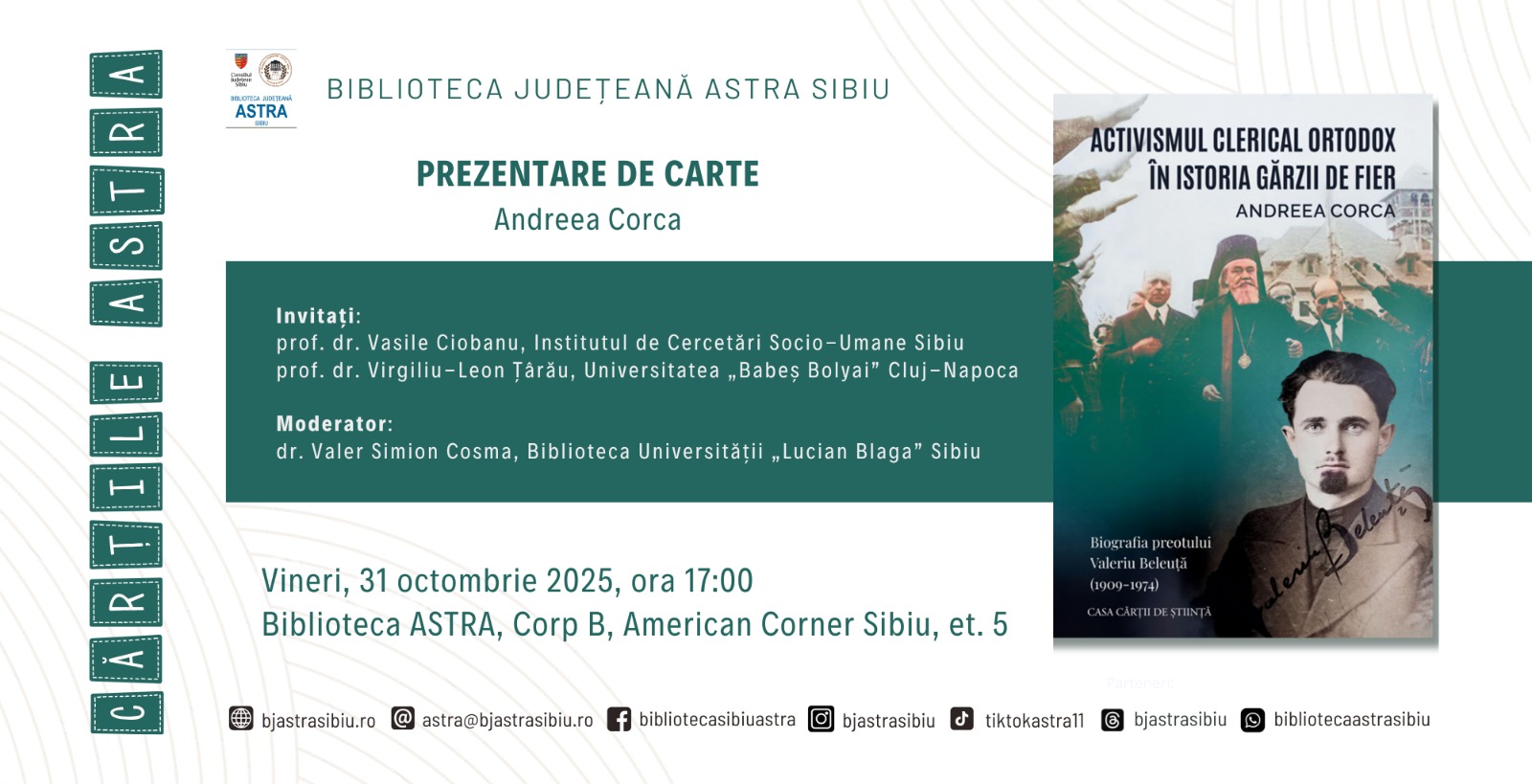 „Activismul clerical ortodox în istoria Gărzii de Fier. Biografia preotului Valeriu Beleuță (1909–1974)” este titlul volumului semnat de Andreea Corca, muzeograf în cadrul Muzeului Național Brukenthal, care va fi lansat mâine, 31 octombrie, la Biblioteca Județeană ASTRA Sibiu. Volumul analizează fenomenul legionar din perspectiva biografică a preotului Valeriu Beleuță, alegerea personalității acestuia fiind una întâmplătoare, dar aproape naturală: „a fost parohul bunicilor mei paterni. Tatăl meu a fost botezat chiar de acesta”, spune autoarea.