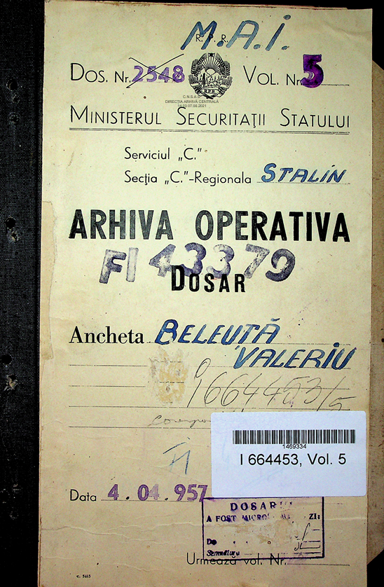 Coperta dosarului de urmărire informativă deschis de Securitate pe numele lui Valeriu Beleuță.