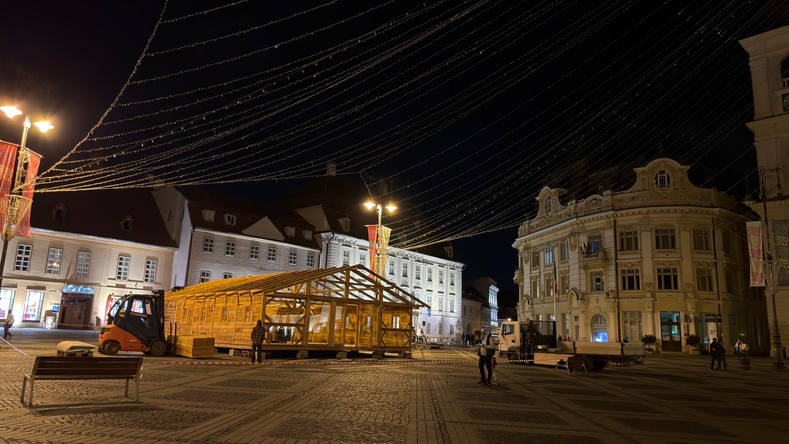 E 3 noiembrie 2025 în calendar, dar în Piața Mare din Sibiu se apropie atmosfera de Crăciun. Muncitorii Primăriei au început să instaleze bradul.