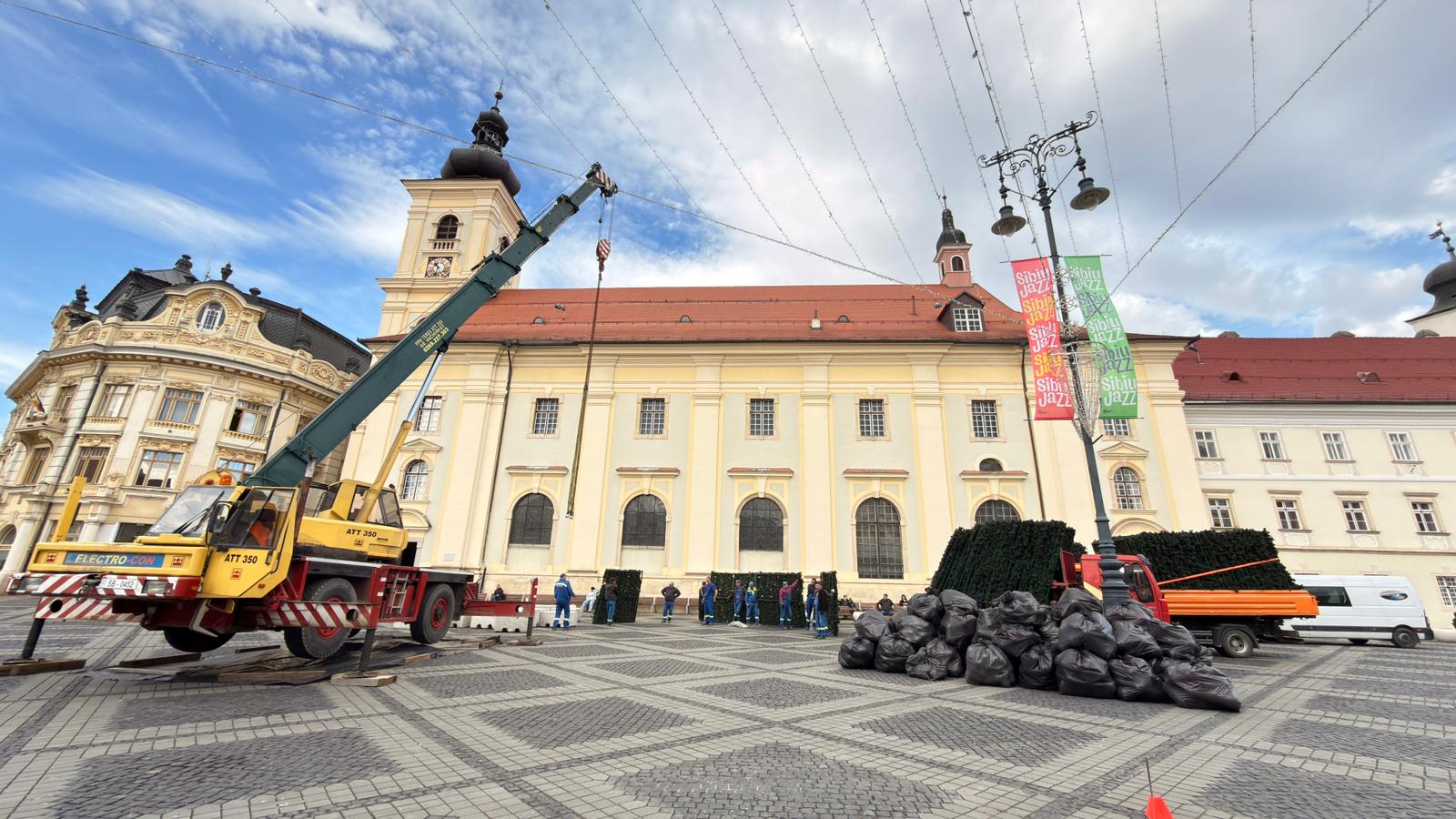 E 3 noiembrie 2025 în calendar, dar în Piața Mare din Sibiu se apropie atmosfera de Crăciun. Muncitorii Primăriei au început să instaleze bradul.
