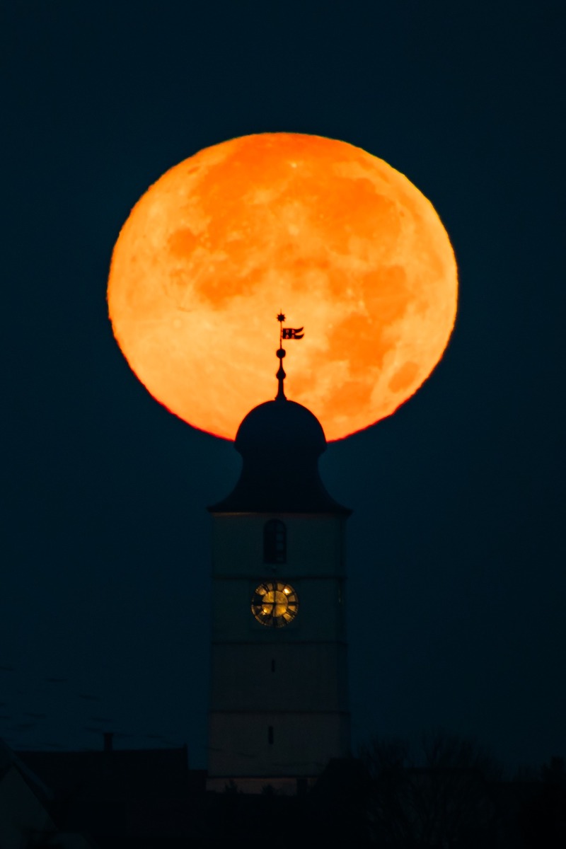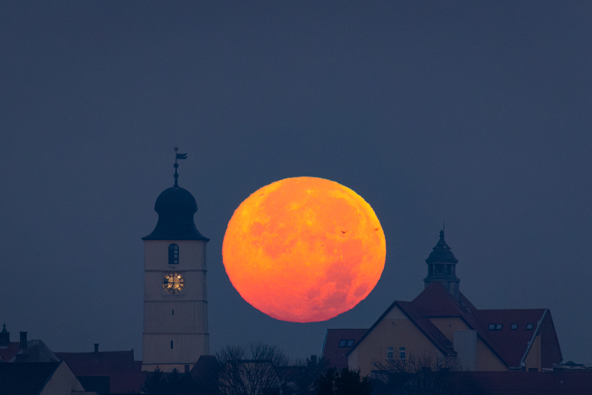 „Superluna Castorului s-a văzut azi dimineață și la Sibiu. Chiar dacă norii erau cât pe ce să încurce vizibilitatea, până la urmă natura a oferit un spectacol deosebit. Niciodată nu am reușit să fotografiez luna atât de jos la orizont, la o elevație de mai puțin de un grad. Imaginea a fost realizată spre finalul orei albastre, la ora 6:49, cu o distanță focală de 840 mm, f/11, ISO 5000, 1/20s. În stânga, Turnul Sfatului, iar în dreapta clădirea Consiliului Județean. Mai am și altele, mai urmează”, a notat acesta.