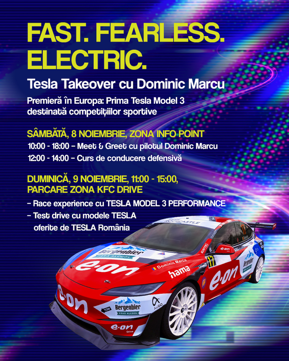 Shopping City Sibiu găzduiește în perioada 8–9 noiembrie un eveniment dedicat pasionaților de automobile și siguranță rutieră, în cadrul căruia vizitatorii vor avea ocazia să descopere performanța, tehnologia și inovația care definesc brandul TESLA. În plus, publicul va putea vedea în premieră în Europa prima TESLA Model 3, destinată competițiilor sportive, prezentată de pilotul român Dominic Marcu, primul sportiv din țară care concurează exclusiv cu mașini electrice.