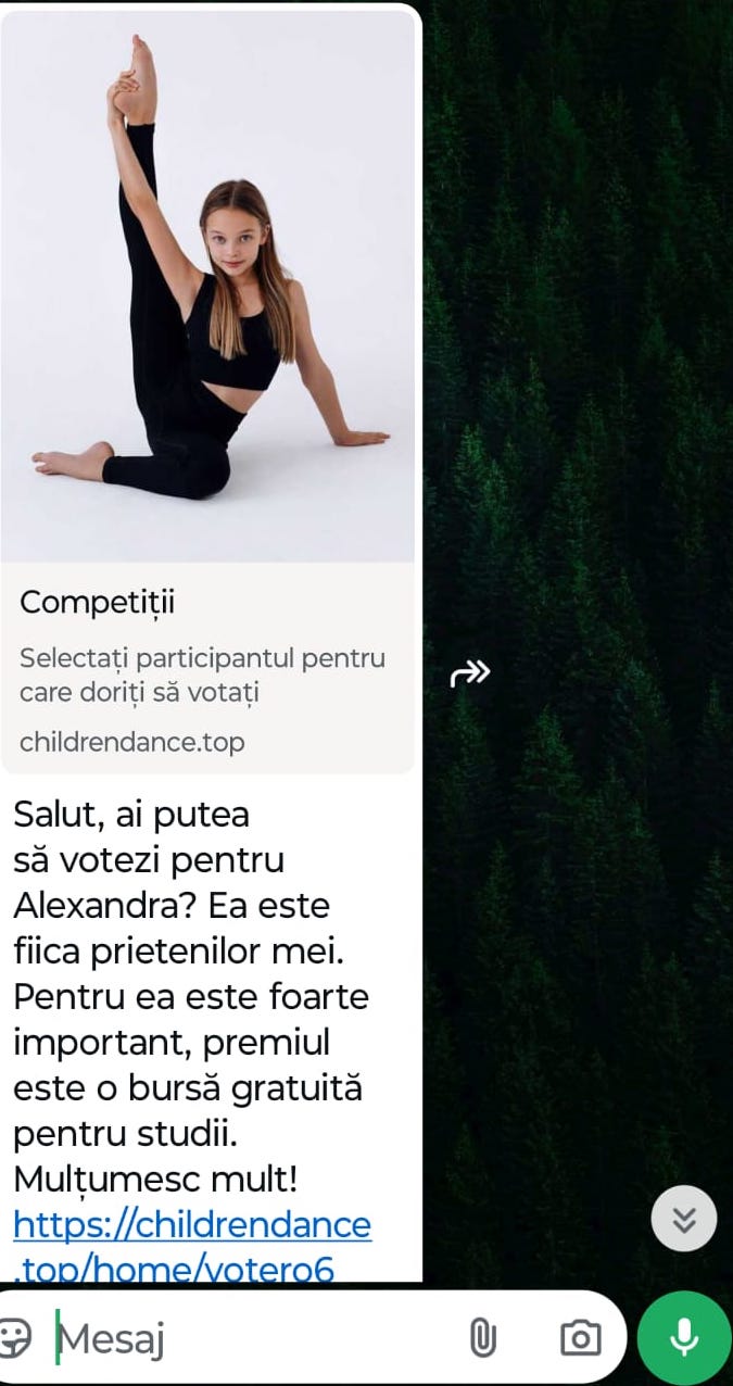 Femeia povestește că, în urmă cu câteva săptămâni, a primit un mesaj pe WhatsApp de la o persoană în care avea deplină încredere. Aceasta îi solicita să voteze o tânără care ar fi urmat să primească o bursă pentru studii gratuite.