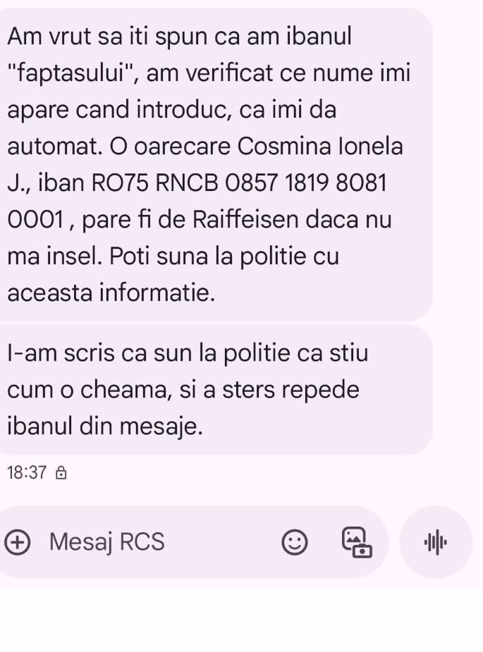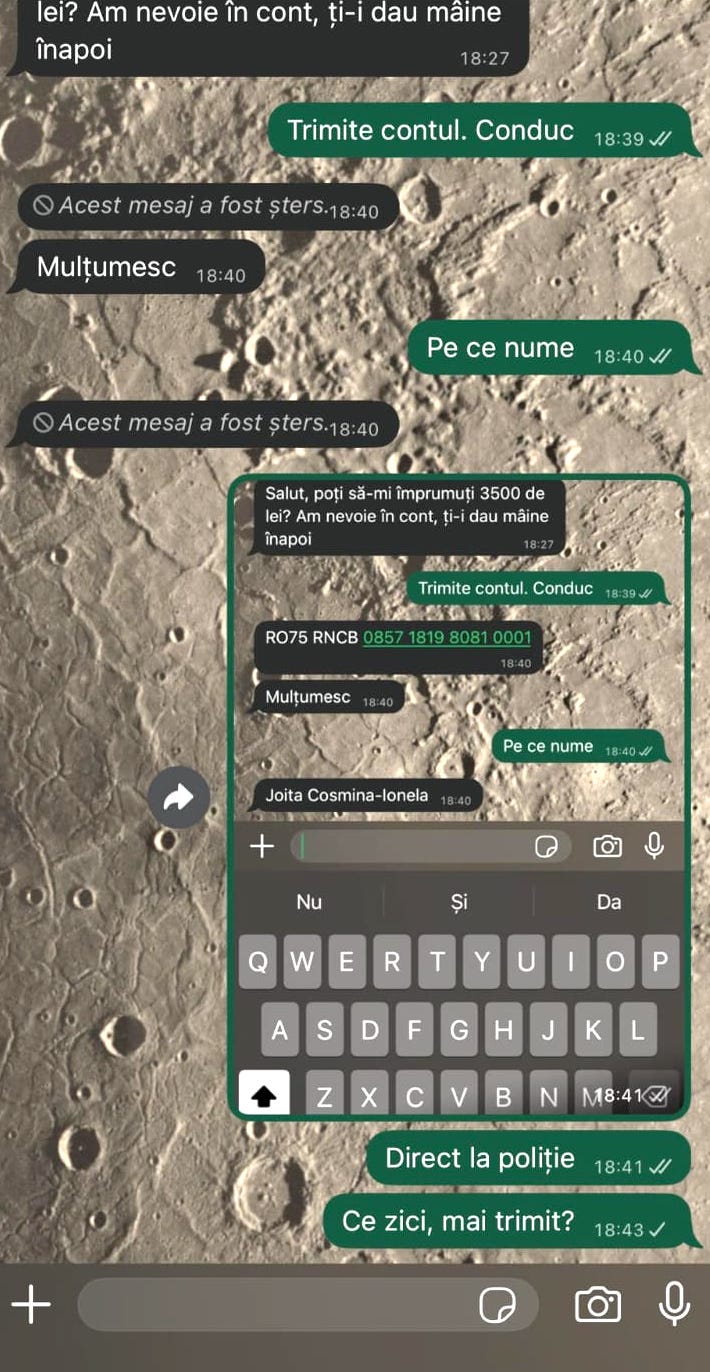 Una dintre persoanele din lista ei a intuit că este vorba despre o fraudă și a continuat conversația cu escrocii pentru a obține date suplimentare. „A reușit să obțină contul și numele persoanei care cerea bani. Când i-a spus că va merge la poliție, aceștia au șters tot”, adaugă sibianca.