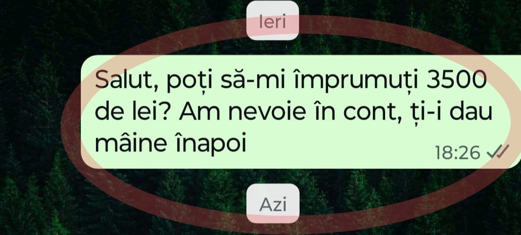 Mesajul fals trimis în numele ei suna astfel: „Salut, poți să-mi împrumuți 3500 de lei? Am nevoie în cont, ți-i dau mâine înapoi.”