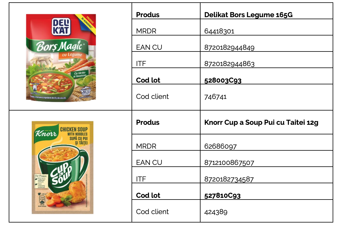 „Unilever si Auchan efectueaza rechemarea produselor: Delikat Bors Legume 165G si Knorr Cup a Soup Pui cu Taitei 12g. Motivul retragerii: posibile particule metalice și de cauciuc. Persoanele care au achizitionat acest produs sunt rugate sa nu il consume, ci sa il returneze la Serviciul Clienti din magazinul Auchan de unde l-au cumparat”, se menționează în document.
