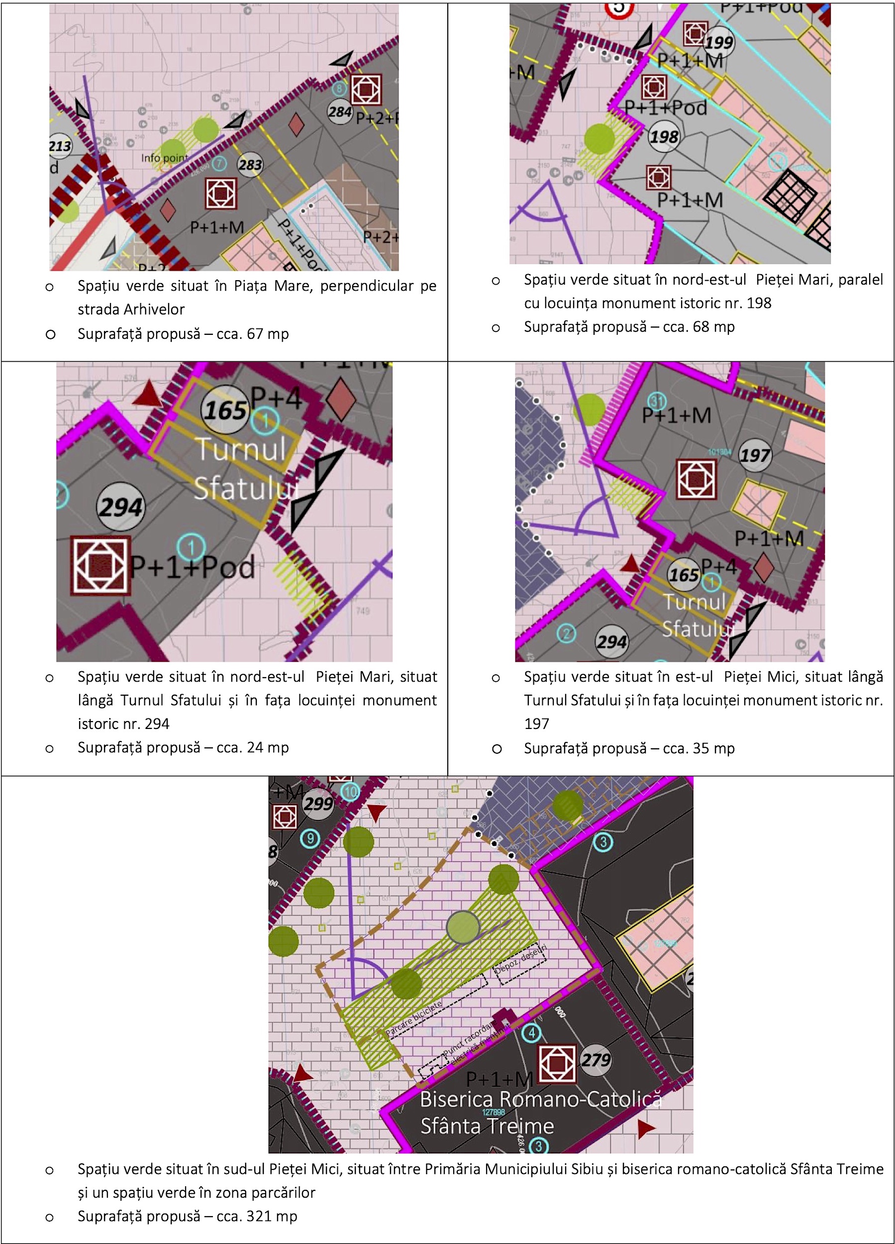 Harta spațiilor care ar mai putea aduce 515 mp de zonă verde în Piața Mare și Piața Mică a fost elaborată doar cu caracter de recomandare. Sursa foto: memoriul general al PUZCP