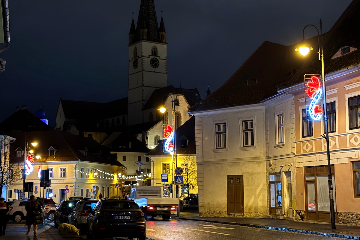 Noile decorațiuni cu inimi au fost amplasate pe străzile din jurul Orașului de Sus. Sursa foto: Silvana Armat / Turnul Sfatului