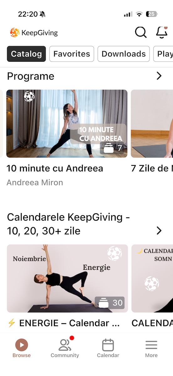 Aplicația KeepGiving oferă peste 150 de video-uri — yoga, respirație, meditație și Barre — toate în limba română. Practicile sunt prietenoase, clare și potrivite oricărui nivel.