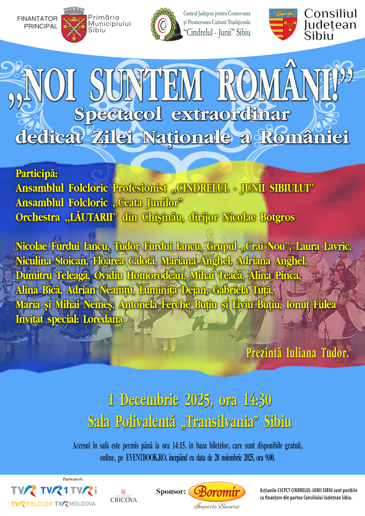 Spectacolul extraordinar „Noi suntem români!” va fi găzduit de Sala Polivalentă „Transilvania”, în 1 Decembrie, începând cu ora 14:30. Accesul publicului în sală este permis până la ora 14:15, pe baza biletelor disponibile gratuit începând cu 28 noiembrie 2025, ora 9:00, exclusiv prin platforma Eventbook.ro.