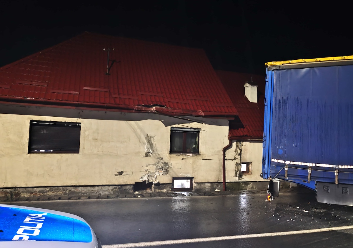 În urma accidentului, remorca unui ansamblu rutier a blocat tot drumul, după ce a lovit o casă și a doborât gardul aflat peste drum.