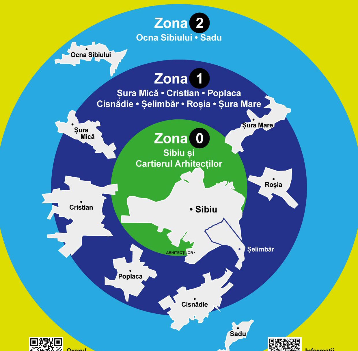 Zona 0 include municipiul Sibiu și Cartierul Arhitecților, în timp ce în zona tarifară 1 sunt cele mai multe localități, și anume Cristian, Roșia, Poplaca, Cisnădie, Șelimbăr, Șura Mare și Șura Mică. În zona 2 (în care intră localitățile care nu au graniță comună cu municipiul Sibiu) intră localitățile Sadu și Ocna Sibiului.