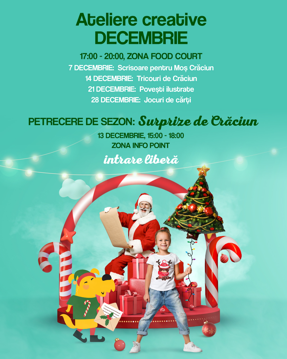 Pe parcursul lunii decembrie, centrul comercial organizează târguri dedicate cadourilor: Târgul de Moș Nicolae, între 4 și 7 decembrie, și Târgul de Moș Crăciun, în perioada 19 - 24 decembrie, unde vizitatorii pot găsi o gamă largă de opțiuni pentru cadouri mai deosebite. Seria de ateliere creative pentru copii continuă în fiecare duminică, în zona Food Court, între orele 17:00–20:00, participare gratuită. Printre activitățile care îi așteaptă pe cei mici se numără: scrisoarea pentru Moș Crăciun, tricouri festive, povești ilustrate și jocuri de cărți. Distracția pentru copii nu se oprește aici: pe 13 decembrie, între 15:00 și 18:00, va avea loc petrecerea tematică „Surprize de Crăciun” în zona Info Point, cu intrare liberă.