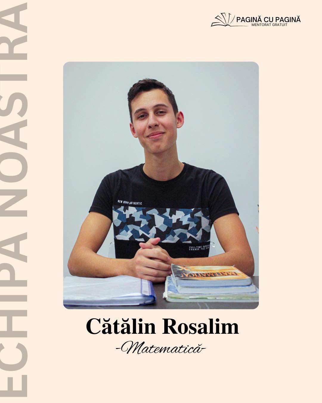 „Voi preda matematica. La Evaluarea Națională am obținut 9,35, cu media generala de anul trecut 9. În clasa a VII-a am participat la Olimpiada Lumina Math, unde am reușit să ocup locul 4 pe județ. Îmi place să explic conceptele pas cu pas, să ofer exemple clare și să găsim împreună metode care să facă materia mai ușor de înțeles. Cred că este important ca elevii să se simtă confortabil să întrebe și să exerseze fără teamă. Abia aștept să începem să lucrăm împreună!”