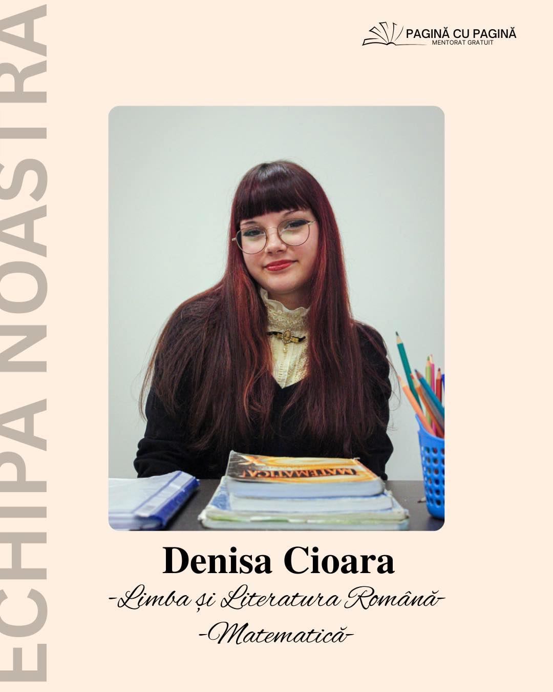 „Voi preda matematica și limba și literatura română. La Evaluarea Națională am obținut 9,40 la română, 9,45 la matematică, cu o medie finală de 9,42. În clasa a V-a am obținut Premiul I la concursul „Călătorie în lumea sentimentelor”, secțiunea claselor a V-a – a VI-a. De asemenea, în clasa a VI-a am participat atât la matematică, cât și la română, la concursurile Goga Junior și Lazăr Junior. Îmi place să explic pe înțeles, să lucrăm într-un ritm potrivit fiecăruia și să găsim metode diferite atunci când ceva devine dificil. Pentru mine e important ca toată lumea să se simtă confortabil să întrebe, să exerseze și să învețe. Abia aștept să lucrăm împreună!”