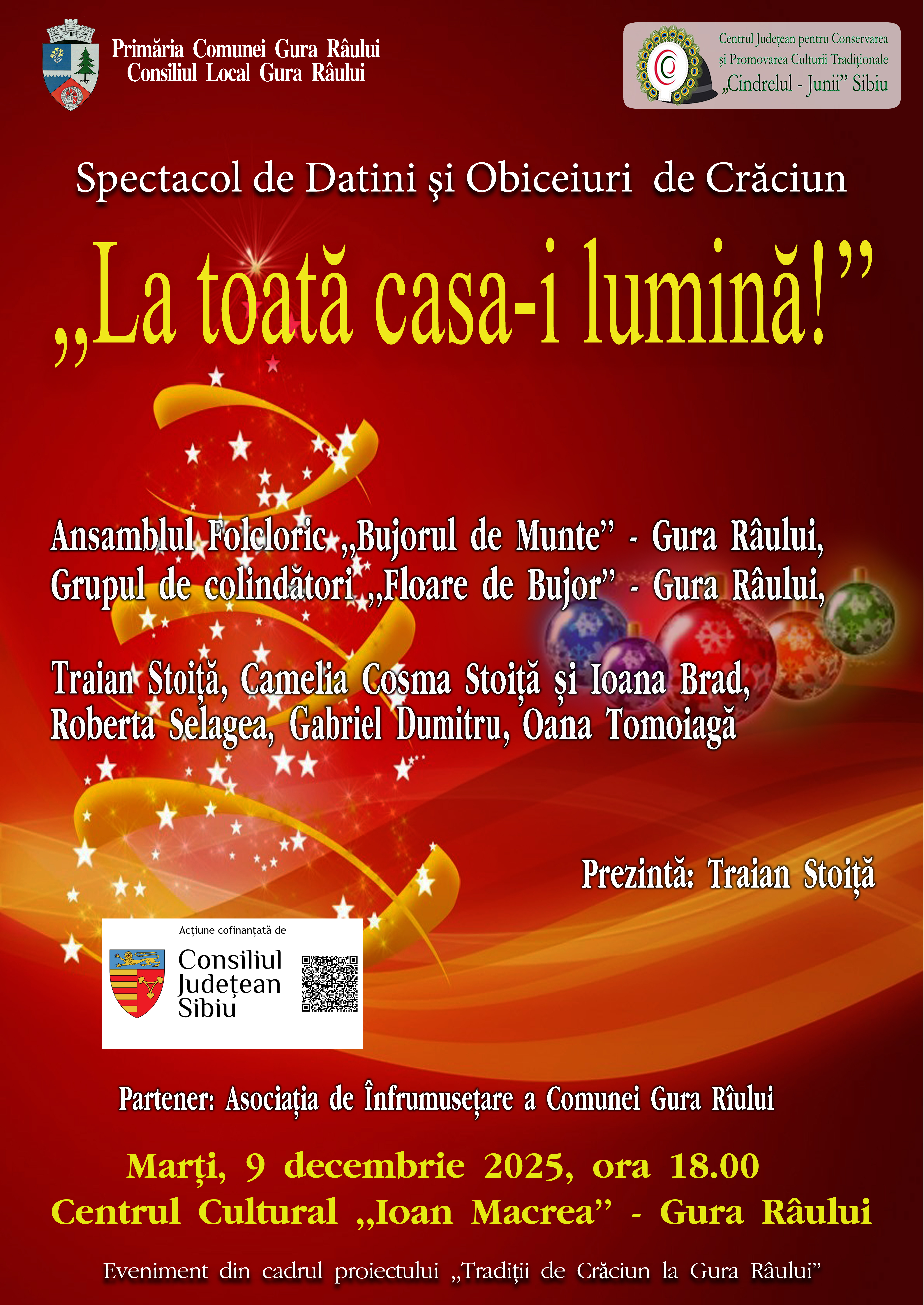 E îndătinat în comuna sibiană Gura Râului, ca înainte de Crăciun, comunitatea să se reunească pentru Spectacolul „La toată casa-i lumină”. Acesta are loc marți 9 decembrie, ora 18, la Centrul Cultural „Ioan Macrea”, și va pune în valoare datinile locului, colindele satului, hainele românești, cântecele și jocurile populare. Și cum gurănii sunt bucuroși de oaspeți, în spectacol vor evolua și invitați de pe alte meleaguri. Astfel, pe scenă vor urca artiști îndrăgiți- Roberta Selagea, Oana Tomoiagă, Gabriel Dumitru, Traian Stoiță, Camelia Cosma Stoiță, Ioana Brad, alături de Grupul de colindători „Floare de Bujor” și Ansamblul Folcloric „Bujorul de Munte”. Prezentarea spectacolului va fi asigurată de Traian Stoiță.