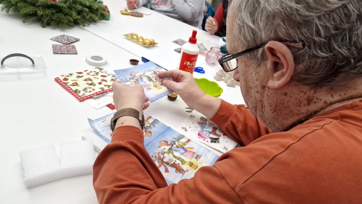 Discuțiile curg firesc, printre gesturi mărunte și indicații practice: unde se mai pune o mărgea, cum se fixează un ornament, dacă distanțele sunt egale. Cineva caută un coș de gunoi, altcineva aduce o pungă. Ritmul este calm, fără grabă.