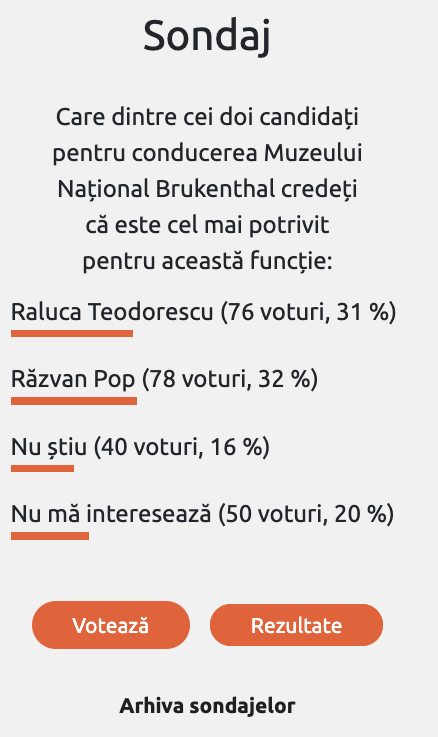 Citorii Turnul Sfatului din Sibiu au fost invitați să își exprime opinia cu privire la cine ar fi cel mai potrivit pentru conducerea Muzeului Național Brukenthal. Conform sondajului desfășurat pe site-ul publicației, preferințele cititorilor sunt împărțite aproape egal între cei doi candidați:
