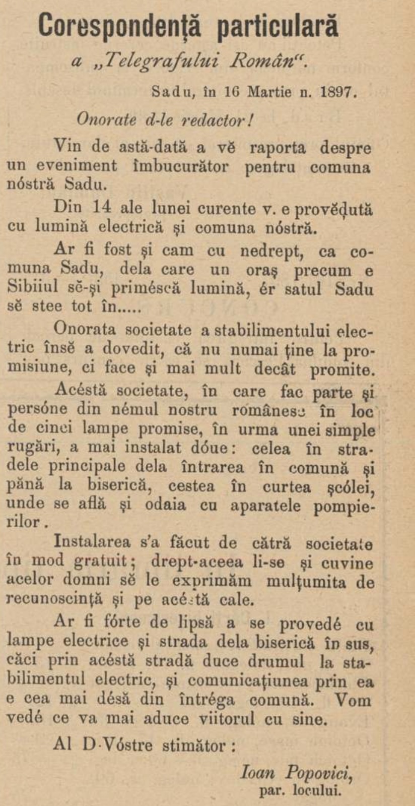 ”Cu seara de Sâmbătă, felinarele cu petroleu şi-au terminat misiunea lor în Sibiiu. Progresul timpului le-a delăturat, înlocuindu-le cu mândra lumină electrică.